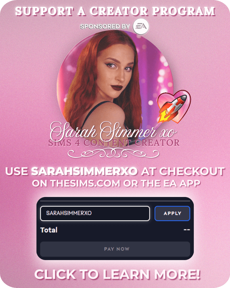 β¨ If you’re planning to treat yourself to Sims 4 packs or kits, you can use my Creator Code SARAHSIMMERXO at checkout on TheSims.com, or the EA App, it helps support my work at no extra cost to you, and you’re basically an icon for it. π